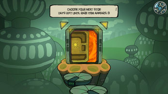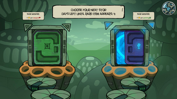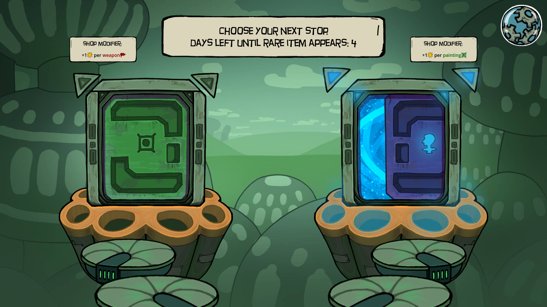 - After you exit shop you can choose a door to 1 of 2 next shops. Door color represents location which affects what cards are sold. Also you can see a modifier above each door. This modifier allows you to gain more value when selling your items.