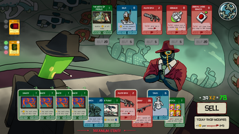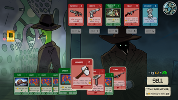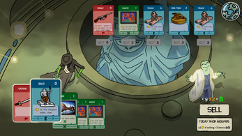 - Select a group of cards to sell. All cards have base cost and some have effects that will increase cards total cost. You can sell only one group of cards per shop. Press “sell” button to confirm. After you sell items you can buy new cards from the shop. Your objective is to obtain more and more powerful cards. All remaining money will disappear after you leave the shop. (lore-wise there is no money in the game world, this is just an imaginary counter of the value.)