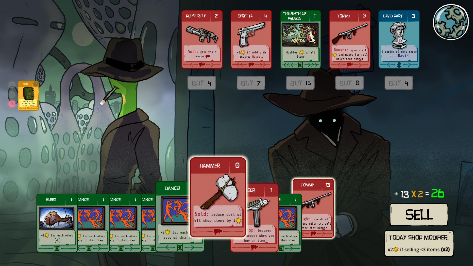 - After 5 normal shops you will encounter a special shop. There you have only 1 very expensive card to buy. You must buy it, otherwise you lose the game. In this shop you can sell multiple groups of items. Each special item will give you some powerful passive effect.